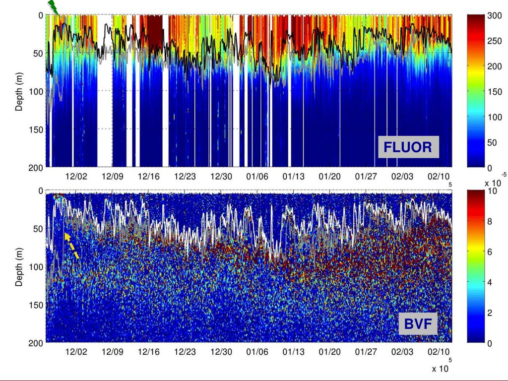 Cyclone Submeso filament -eddy Front edge Cyclone edge Intrusion Strat. (BVF) 0-100m & 100-300m MLD Fluor Temp Poster by S. Nicholson et al: PP sensitivities to submesodyn and subseasatm forcing Density
