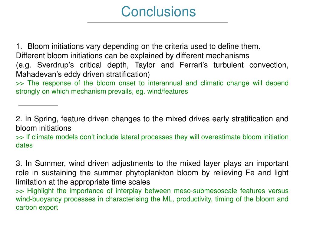 Conclusions Bloom initiations vary depending on the criteria used to define them. Different bloom initiations can be explained by different mechanisms (e.g. Sverdrup’s critical depth, Taylor and Ferrari’s turbulent convection, Mahadevan’s eddy driven stratification) >> The response of the bloom onset to interannual and climatic change will depend strongly on which mechanism prevails, eg. wind/features 2. In Spring, feature driven changes to the mixed drivesearly stratification and bloom initiations >> If climate models don’t include lateral processes they will overestimate bloom initiation dates 3. In Summer, wind driven adjustments to the mixed layer plays an important role in sustaining the summer phytoplankton bloom by relieving Fe and light limitation at the appropriate time scales >> Highlight the importance of interplay between meso-submesoscale features versus wind-buoyancy processes in characterising the ML, productivity, timing of the bloom and carbon export