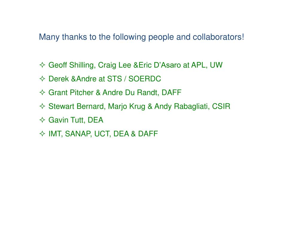 Many thanks to the following people and collaborators! • Geoff Shilling, Craig Lee &Eric D’Asaro at APL, UW • Derek &Andre at STS / SOERDC • Grant Pitcher & Andre Du Randt, DAFF • Stewart Bernard, Marjo Krug & Andy Rabagliati, CSIR • Gavin Tutt, DEA • IMT, SANAP, UCT, DEA & DAFF