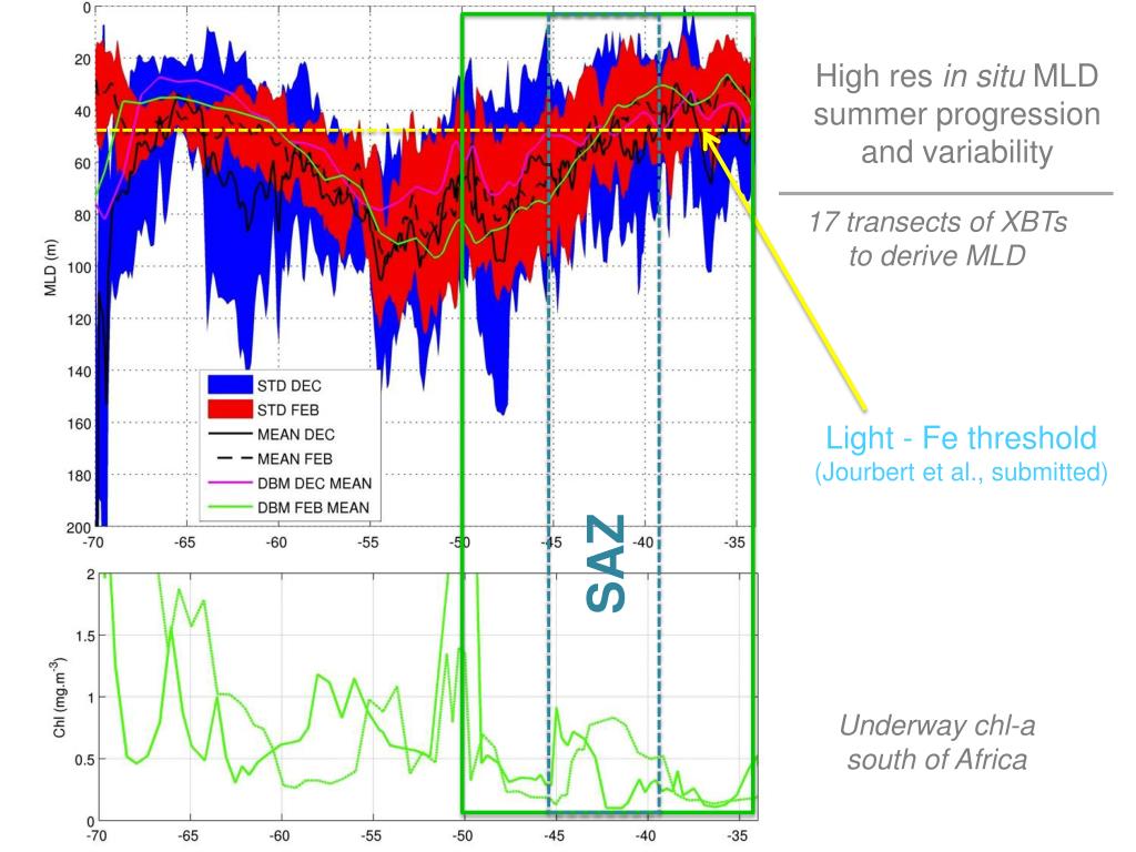 High res in situ MLD summer progression and variability 17 transects ofXBTs to derive MLD Light - Fe threshold (Jourbert et al., submitted) SAZ Underway chl-a south of Africa