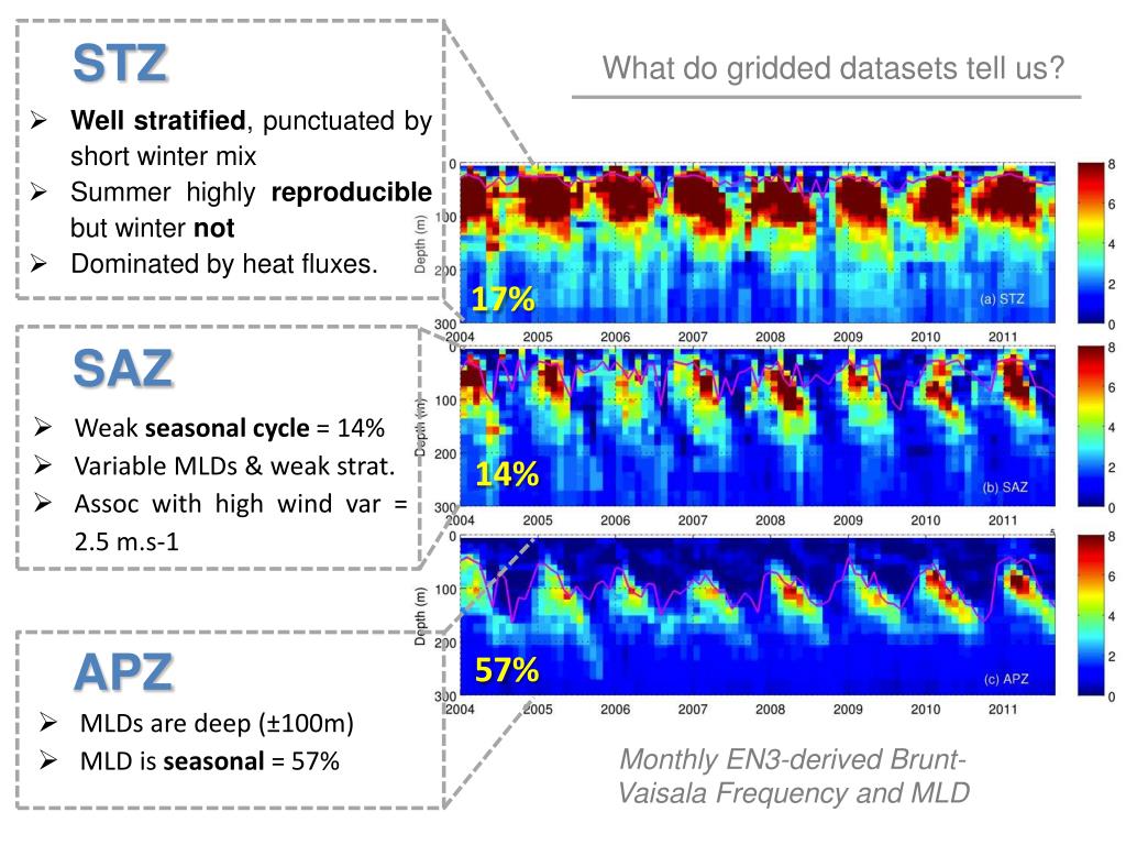 STZ What do gridded datasets tell us? • Well stratified, punctuated by short winter mix • Summer highly reproducible but winter not • Dominated by heat fluxes. 17% SAZ • Weak seasonal cycle = 14% • Variable MLDs & weak strat. • Assoc with high wind var= 2.5 m.s-1 14% APZ 57% • MLDs are deep (±100m) • MLD isseasonal = 57% Monthly EN3-derived Brunt-Vaisala Frequency and MLD