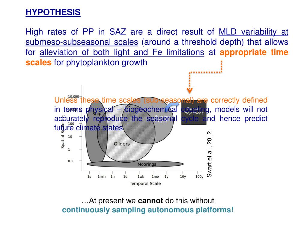 HYPOTHESIS High rates of PP in SAZ are a direct result of MLD variability at submeso-subseasonal scales (around a threshold depth) that allows for alleviation of both light and Fe limitations at appropriate time scales for phytoplankton growth Unless these time scales (sub-seasonal) are correctly defined in terms physical – biogeochemical coupling, models will not accurately reproduce the seasonal cycle and hence predict future climate states Swart et al., 2012 …At present we cannotdo this without continuously sampling autonomous platforms!