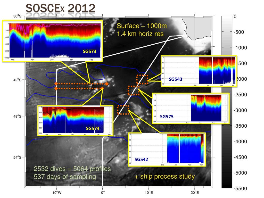 Surface – 1000m 1.4 km horiz res SG573 SG543 SG575 SG574 SG542 2532 dives = 5064 profiles 537 days of sampling + ship process study