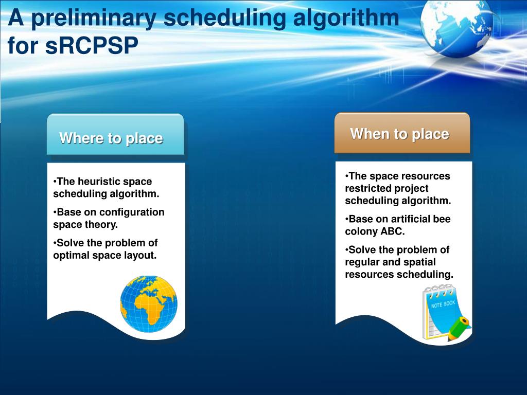 A preliminary scheduling algorithm for sRCPSP When to place Where to place • The space resources restricted project scheduling algorithm. • Base on artificial bee colony ABC. • Solve the problem of regular and spatial resources scheduling. • The heuristic space scheduling algorithm. • Base on configuration space theory. • Solve the problem of optimal space layout.