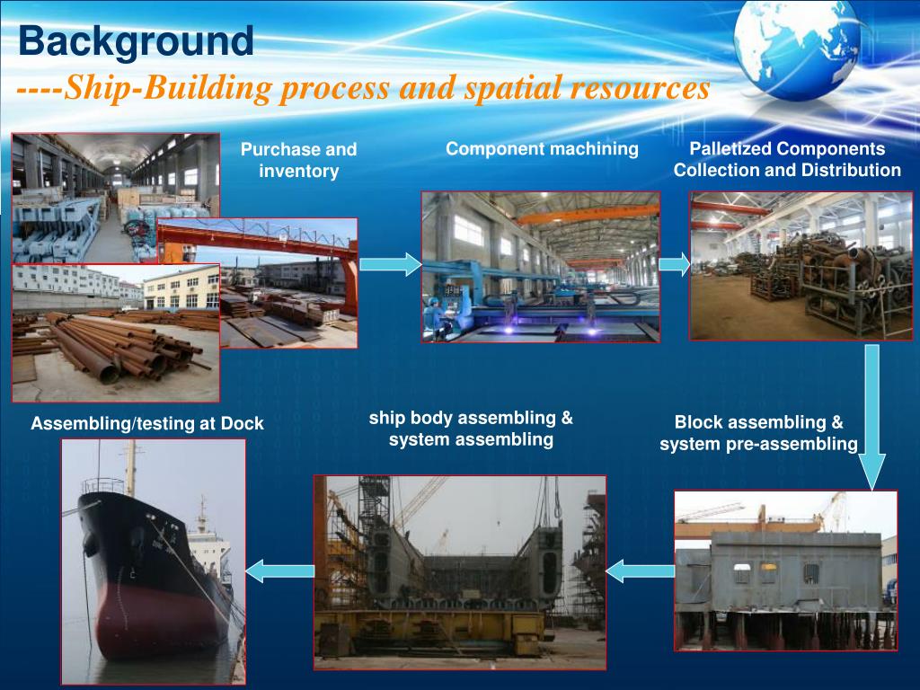 Background----Ship-Building process and spatial resources Component machining Palletized Components Collection and Distribution Purchase and inventory ship body assembling & system assembling Block assembling & system pre-assembling Assembling/testing at Dock