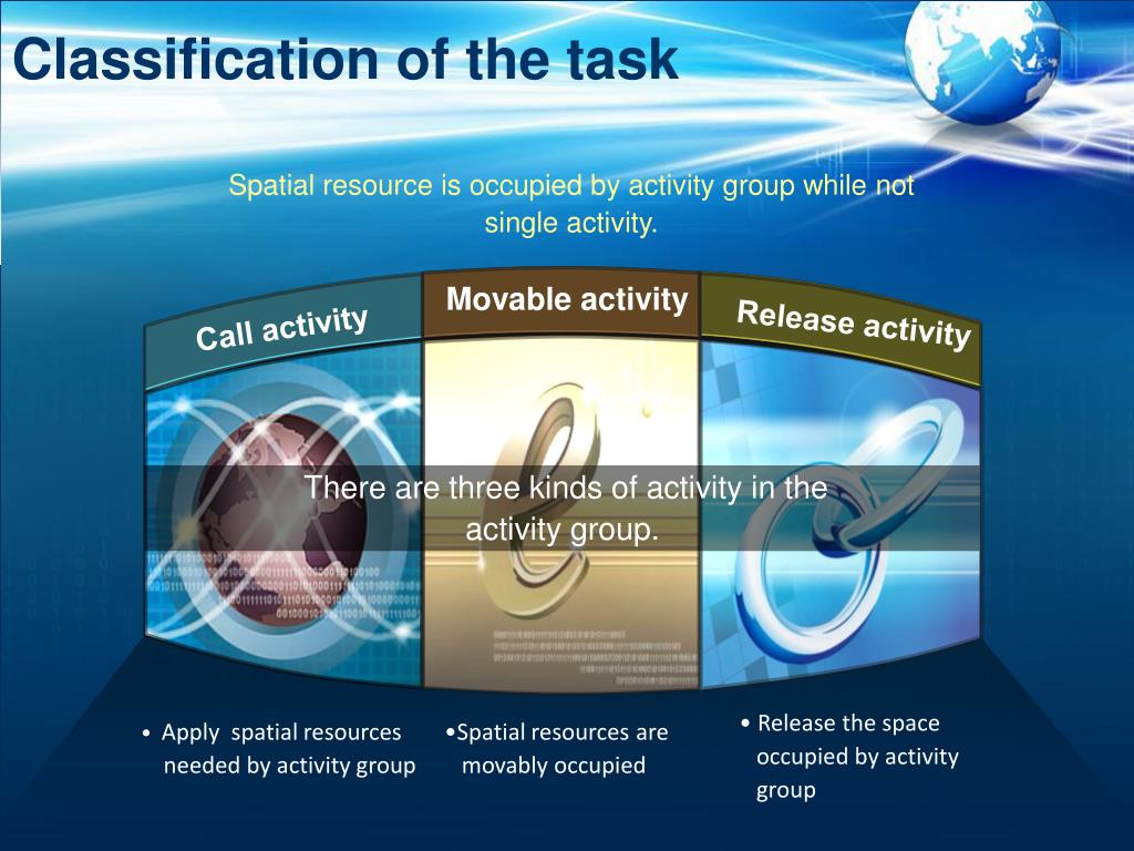 Classification of the task Spatial resource is occupied by activity group while not single activity. Movable activity Release activity Call activity There are three kinds of activity in the activity group. • Release the space • occupied by activity • group • Apply spatial resources • needed by activity group • Spatial resources are • movably occupied