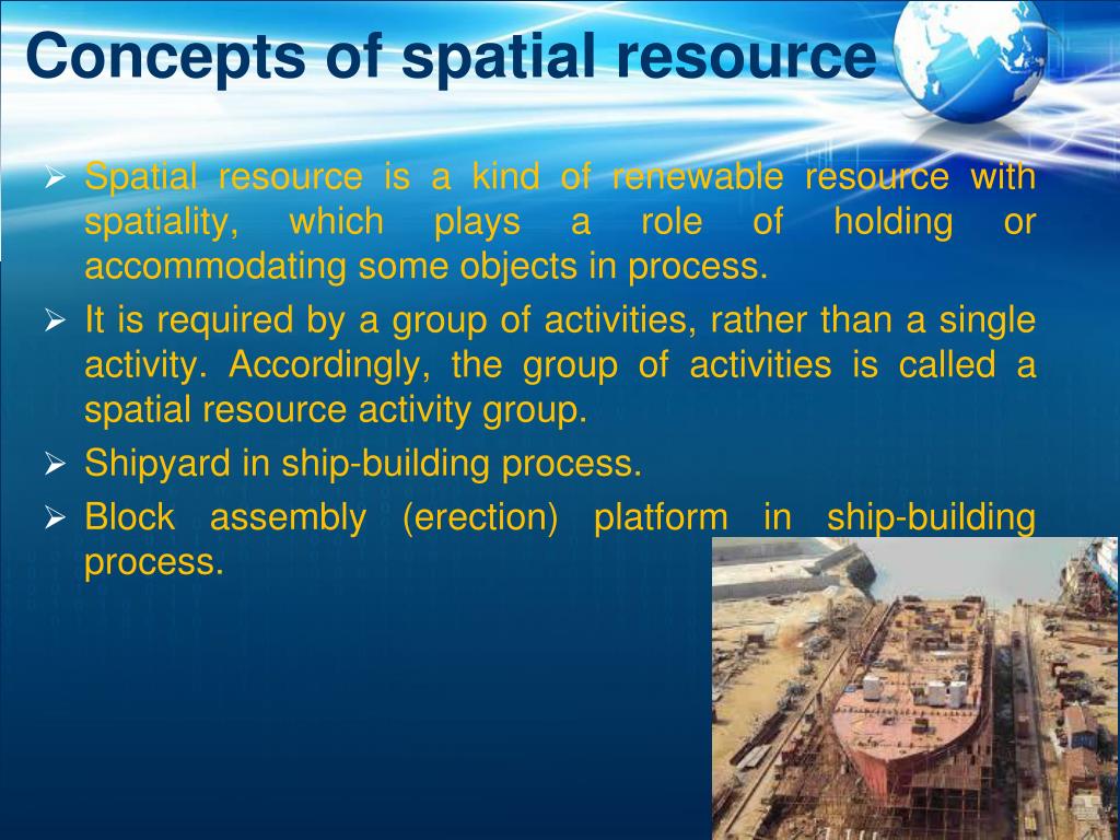 Concepts of spatial resource • Spatial resource is a kind of renewable resource with spatiality, which plays a role of holding or accommodating some objects in process. • It is required by a group of activities, rather than a single activity. Accordingly, the group of activities is called a spatial resource activity group. • Shipyard in ship-building process. • Block assembly (erection) platform in ship-building process.