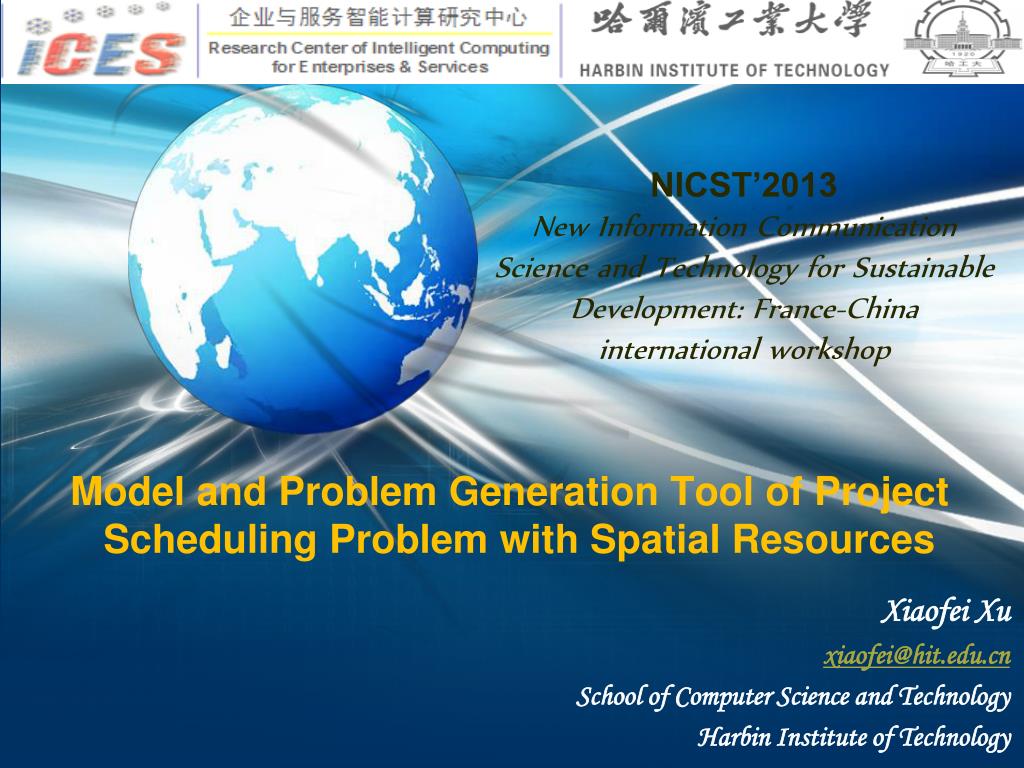 NICST’2013 New Information Communication Science and Technology for Sustainable Development: France-China international workshop. Model and Problem Generation Tool of Project Scheduling Problem with Spatial Resources. Xiaofei Xu xiaofei@hit.edu.cn