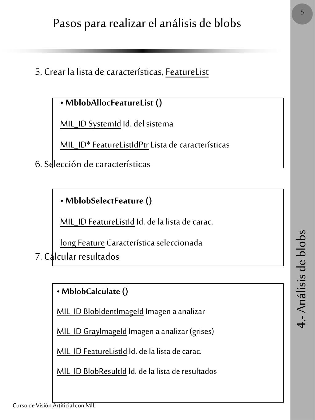 Pasos para realizar el análisis de blobs 5. Crear la lista de características, FeatureList 6. Selección de características 7. Cálcular resultados • MblobAllocFeatureList () • MIL_ID SystemIdId. del sistema • MIL_ID* FeatureListIdPtrLista de características • MblobSelectFeature () • MIL_ID FeatureListIdId. de la lista de carac. • long FeatureCaracterística seleccionada • MblobCalculate () • MIL_ID BlobIdentImageIdImagen a analizar • MIL_ID GrayImageId Imagen a analizar (grises) • MIL_ID FeatureListIdId. de la lista de carac. • MIL_ID BlobResultIdId. de la lista de resultados Curso de Visión Artificial con MIL