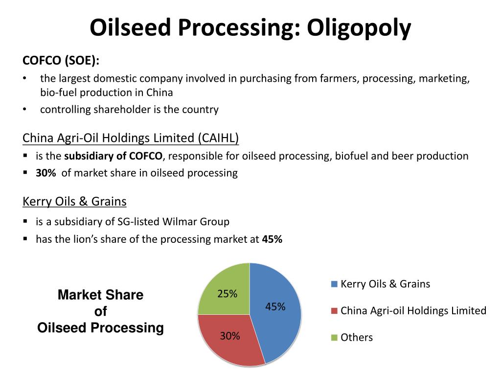 Oilseed Processing: Oligopoly COFCO (SOE): the largest domestic company involved in purchasing from farmers, processing, marketing, bio-fuel production in China controlling shareholder is the country China Agri-Oil Holdings Limited (CAIHL) is the subsidiary of COFCO, responsible for oilseed processing, biofuel and beer production 30% of market share in oilseed processing Kerry Oils & Grains isa subsidiary of SG-listed Wilmar Group has the lion’s share of the processing market at 45% Market Share of Oilseed Processing