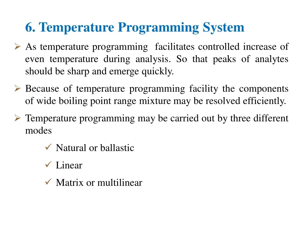 24. 6. Temperature Programming System  As temperature programming facilitates controlled increase of even temperature during analysis. So that peaks of analytes should be sharp and emerge quickly.  Because of temperature programming facility the components of wide boiling point range mixture may be resolved efficiently.  Temperature programming may be carried out by three different modes  Natural or ballastic  Linear  Matrix or multilinear