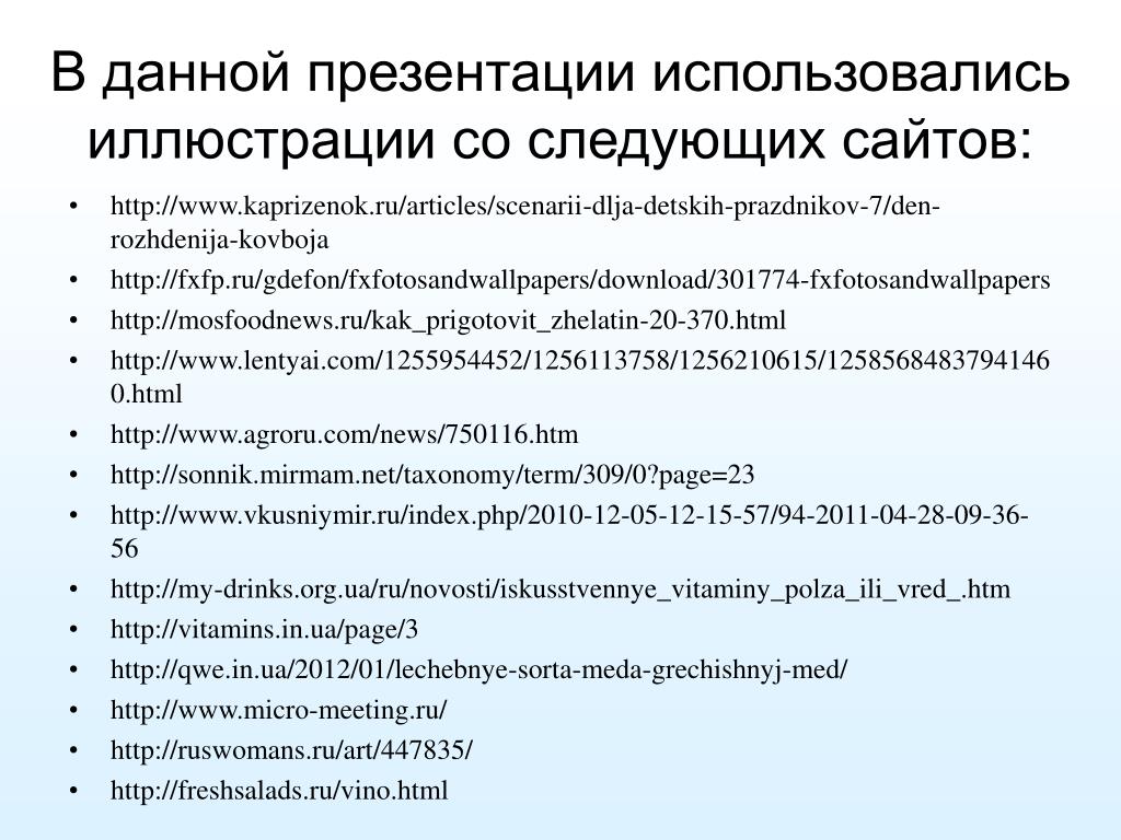 В данной презентации использовались иллюстрации со следующих сайтов: • http://www.kaprizenok.ru/articles/scenarii-dlja-detskih-prazdnikov-7/den-rozhdenija-kovboja • http://fxfp.ru/gdefon/fxfotosandwallpapers/download/301774-fxfotosandwallpapers • http://mosfoodnews.ru/kak_prigotovit_zhelatin-20-370.html • http://www.lentyai.com/1255954452/1256113758/1256210615/12585684837941460.html • http://www.agroru.com/news/750116.htm • http://sonnik.mirmam.net/taxonomy/term/309/0?page=23 • http://www.vkusniymir.ru/index.php/2010-12-05-12-15-57/94-2011-04-28-09-36-56 • http://my-drinks.org.ua/ru/novosti/iskusstvennye_vitaminy_polza_ili_vred_.htm • http://vitamins.in.ua/page/3 • http://qwe.in.ua/2012/01/lechebnye-sorta-meda-grechishnyj-med/ • http://www.micro-meeting.ru/ • http://ruswomans.ru/art/447835/ • http://freshsalads.ru/vino.html