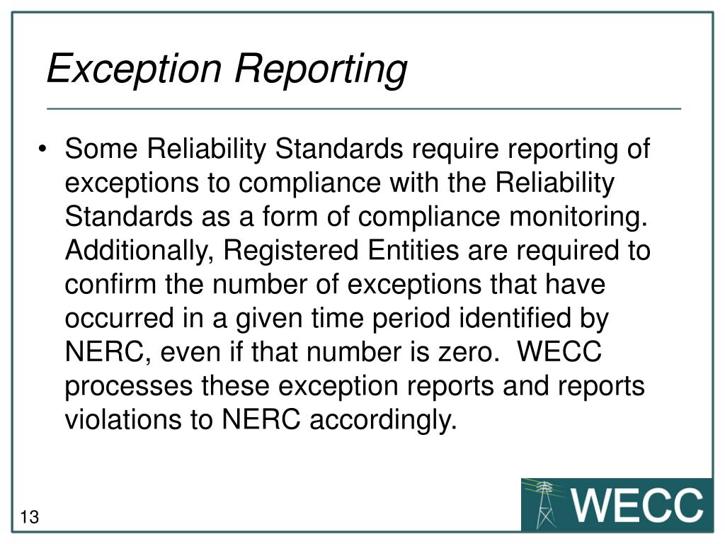 Exception Reporting • Some Reliability Standards require reporting of exceptions to compliance with the Reliability Standards as a form of compliance monitoring. Additionally, Registered Entities are required to confirm the number of exceptions that have occurred in a given time period identified by NERC, even if that number is zero. WECC processes these exception reports and reports violations to NERC accordingly.