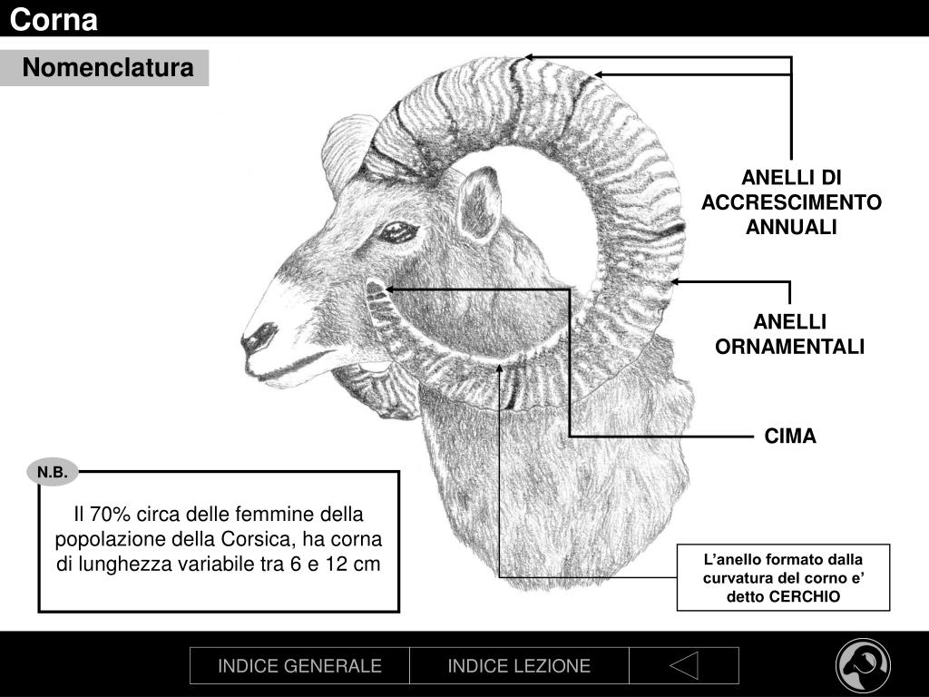 Corna Nomenclatura ANELLI DI ACCRESCIMENTO ANNUALI ANELLI ORNAMENTALI CIMA N.B. Il 70% circa delle femmine della popolazione della Corsica, ha corna di lunghezza variabile tra 6 e 12 cm L’anello formato dalla curvatura del corno e’ detto CERCHIO