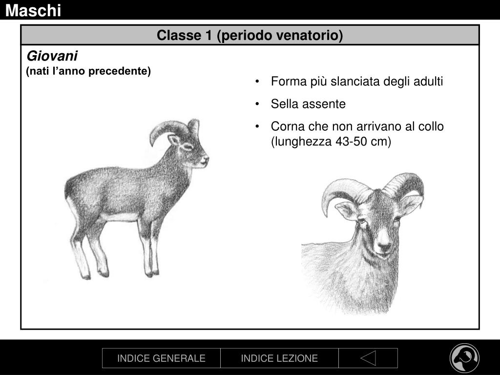 Maschi Classe 2 Adulti(da 2 a 5 anni di età) • Dimensioni corporee definitive • Criniera sviluppata • Sella evidente (soprattutto nel mantello invernale) • Cerchio delle corna di almeno 180 gradi ma che non raggiunge l’occhio • Vivono isolati o in piccoli gruppetti di maschi N.B. La sella compare tra i 2 e i 3 anni d’età