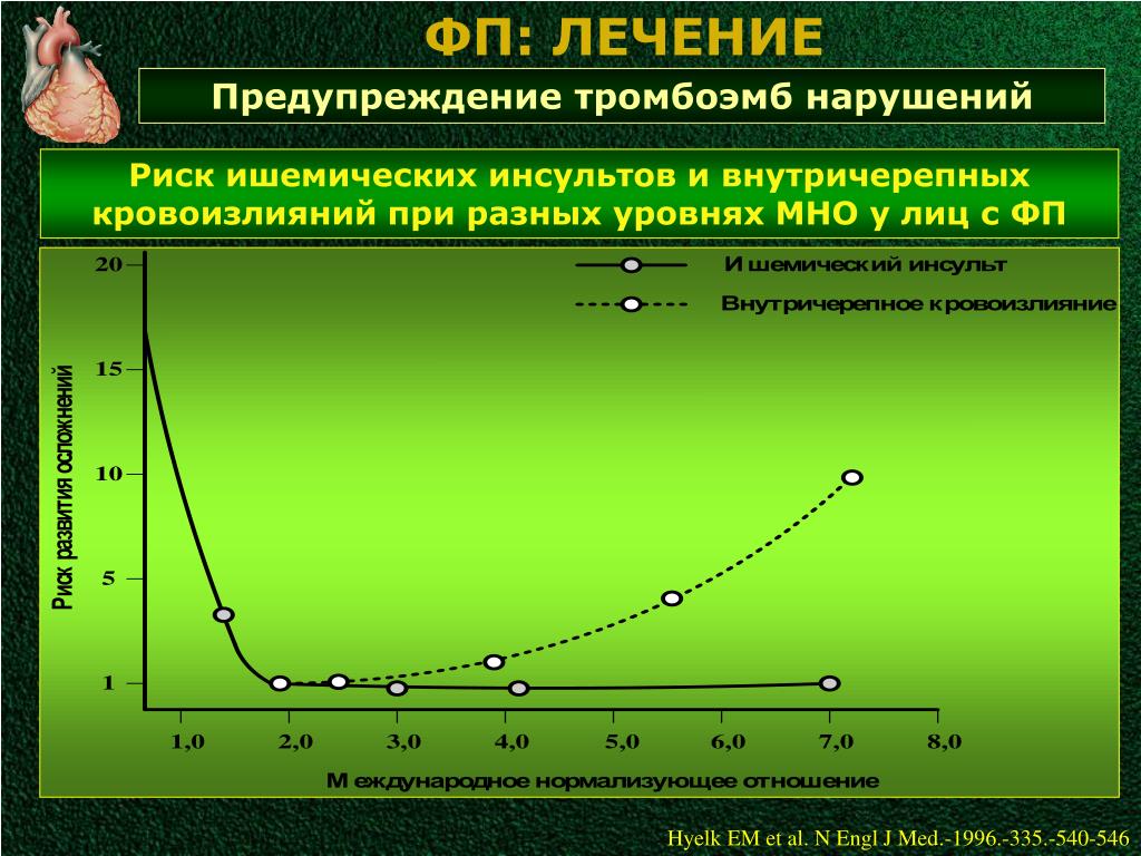 ФП: ЛЕЧЕНИЕ Предупреждение тромбоэмб нарушений Риск ишемических инсультов и внутричерепных кровоизлияний при разных уровнях МНО у лиц с ФП Hyelk EM et al. N Engl J Med.-1996.-335.-540-546