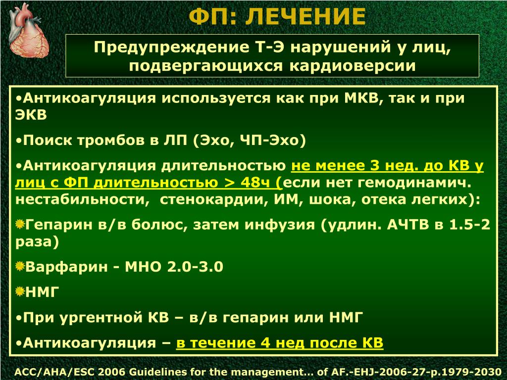 ФП: ЛЕЧЕНИЕ Предупреждение Т-Э нарушений у лиц, подвергающихся кардиоверсии • Антикоагуляция используется как при МКВ, так и при ЭКВ • Поиск тромбов в ЛП (Эхо, ЧП-Эхо) • Антикоагуляция длительностью не менее 3 нед. до КВ у лиц с ФП длительностью > 48ч (если нет гемодинамич. нестабильности, стенокардии, ИМ, шока, отека легких): • Гепарин в/в болюс, затем инфузия (удлин. АЧТВ в 1.5-2 раза) • Варфарин - МНО 2.0-3.0 • НМГ • При ургентной КВ – в/в гепарин или НМГ • Антикоагуляция – в течение 4 нед после КВ ACC/AHA/ESC 2006 Guidelines for the management… of AF.-EHJ-2006-27-p.1979-2030