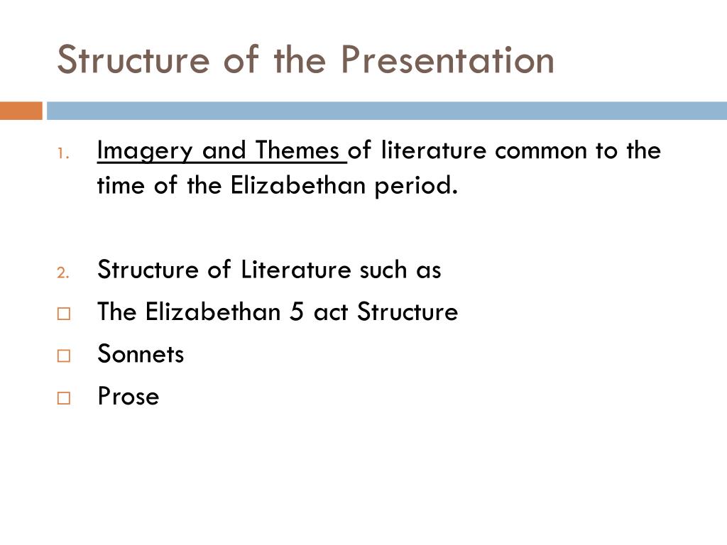 Elizabethan Literature. Main Focus: Imagery and Themes Structure. Structure of the Presentation. Imagery and Themes of literature common to the time of the Elizabethan period. Structure of Literature such as The Elizabethan 5 act Structure Sonnets Prose. Introduction.