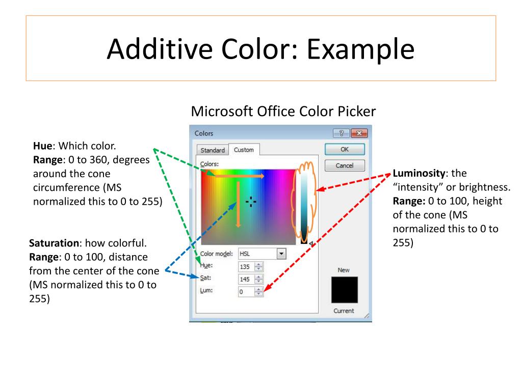 Additive Color: Example Microsoft Office Color Picker Hue: Which color. Range: 0 to 360, degrees around the cone circumference (MS normalized this to 0 to 255) Luminosity: the “intensity” or brightness. Range: 0 to 100, height of the cone (MS normalized this to 0 to 255) Saturation: how colorful. Range: 0 to 100, distance from the center of the cone (MS normalized this to 0 to 255)