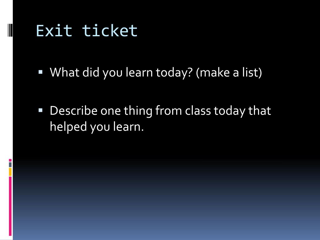 Exit ticket • What did you learn today? (make a list) • Describe one thing from class today that helped you learn.