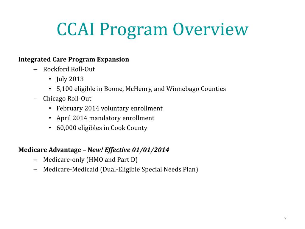 CCAI Program Overview Integrated Care Program Expansion • Rockford Roll-Out • July 2013 • 5,100 eligible in Boone, McHenry, and Winnebago Counties • Chicago Roll-Out • February 2014 voluntary enrollment • April 2014 mandatory enrollment • 60,000 eligibles in Cook County Medicare Advantage – New! Effective 01/01/2014 • Medicare-only (HMO and Part D) • Medicare-Medicaid (Dual-Eligible Special Needs Plan)