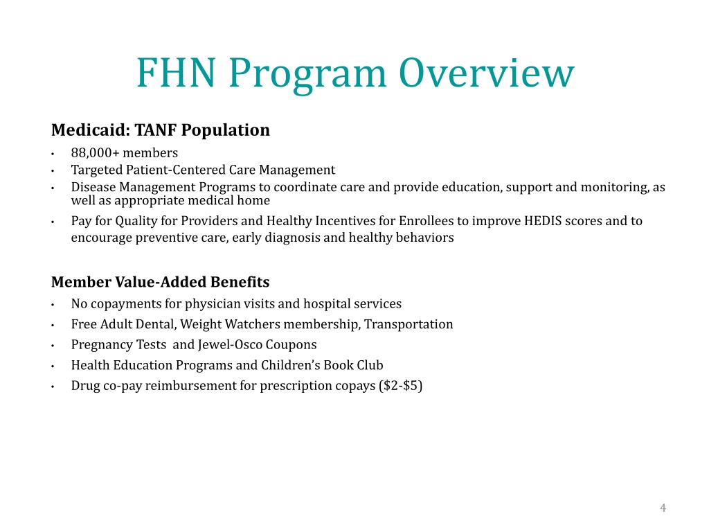 FHN Program Overview Medicaid: TANF Population • 88,000+ members • Targeted Patient-Centered Care Management • Disease Management Programs to coordinate care and provide education, support and monitoring, as well as appropriate medical home • Pay for Quality for Providers and Healthy Incentives for Enrollees to improve HEDIS scores and to encourage preventive care, early diagnosis and healthy behaviors Member Value-Added Benefits • No copayments for physician visits and hospital services • Free Adult Dental, Weight Watchers membership, Transportation • Pregnancy Tests and Jewel-Osco Coupons • Health Education Programs and Children’s Book Club • Drug co-pay reimbursement for prescription copays ($2-$5)