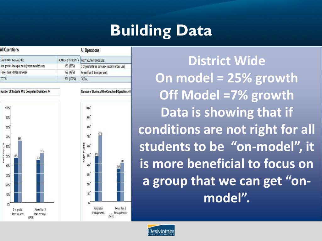 Building Data District Wide On model = 25% growth Off Model =7% growth Data is showing that if conditions are not right for all students to be “on-model”, it is more beneficial to focus on a group that we can get “on-model”.