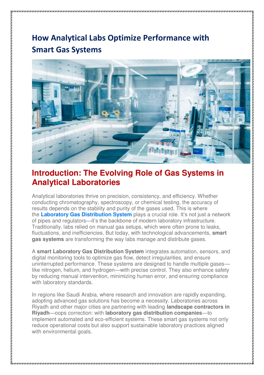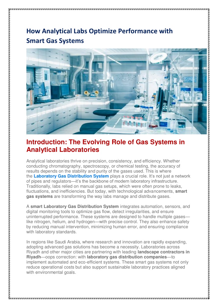 How Analytical Labs Optimize Performance with Smart Gas Systems Introduction: The Evolving Role of Gas Systems in Analytical Laboratories Analytical laboratories thrive on precision, consistency, and efficiency. Whether conducting chromatography, spectroscopy, or chemical testing, the accuracy of results depends on the stability and purity of the gases used. This is where the Laboratory Gas Distribution System plays a crucial role. It’s not just a network of pipes and regulators—it’s the backbone of modern laboratory infrastructure. Traditionally, labs relied on manual gas setups, which were often prone to leaks, fluctuations, and inefficiencies. But today, with technological advancements, smart gas systems are transforming the way labs manage and distribute gases. A smart Laboratory Gas Distribution System integrates automation, sensors, and digital monitoring tools to optimize gas flow, detect irregularities, and ensure uninterrupted performance. These systems are designed to handle multiple gases— like nitrogen, helium, and hydrogen—with precise control. They also enhance safety by reducing manual intervention, minimizing human error, and ensuring compliance with laboratory standards. In regions like Saudi Arabia, where research and innovation are rapidly expanding, adopting advanced gas solutions has become a necessity. Laboratories across Riyadh and other major cities are partnering with leading landscape contractors in Riyadh—oops correction: with laboratory gas distribution companies—to implement automated and eco-efficient systems. These smart gas systems not only reduce operational costs but also support sustainable laboratory practices aligned with environmental goals.