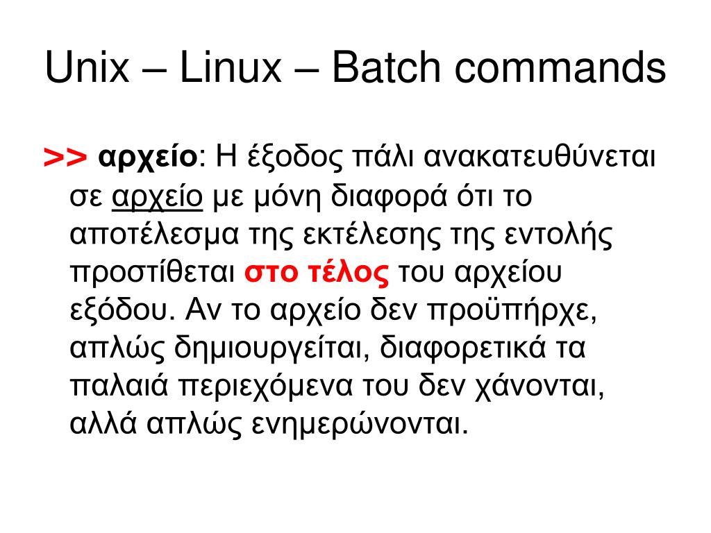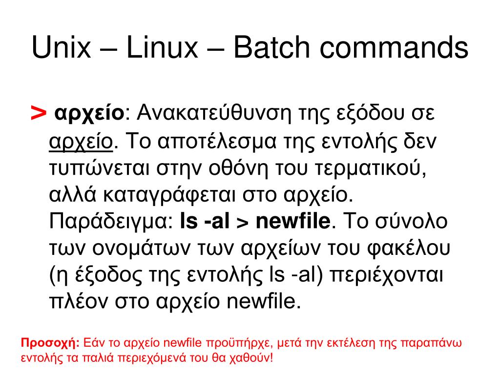 Unix – Linux – Batch commands > αρχείο: Ανακατεύθυνση της εξόδου σε αρχείο. Το αποτέλεσμα της εντολής δεν τυπώνεται στην οθόνη του τερματικού, αλλά καταγράφεται στο αρχείο. Παράδειγμα: ls -al > newfile. Το σύνολο των ονομάτων των αρχείων του φακέλου (η έξοδος της εντολής ls -al) περιέχονται πλέον στο αρχείο newfile. Προσοχή: Εάν το αρχείο newfile προϋπήρχε, μετά την εκτέλεση της παραπάνω εντολής τα παλιά περιεχόμενά του θα χαθούν!
