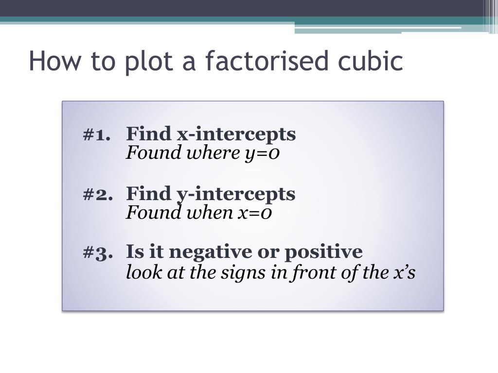 How to plot a factorised cubic #1. Find x-interceptsFound where y=0 #2. Find y-interceptsFound when x=0 #3. Is it negative or positive look at the signs in front of the x’s