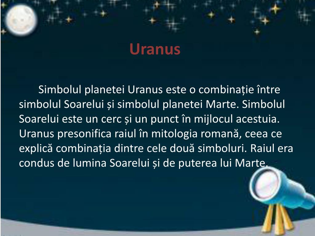 Uranus Simbolul planetei Uranus este o combinație între simbolul Soarelui și simbolul planetei Marte. Simbolul Soarelui este un cerc și un punct în mijlocul acestuia. Uranus presonifica raiul în mitologia romană, ceea ce explică combinația dintre cele două simboluri. Raiul era condus de lumina Soarelui și de puterea lui Marte.