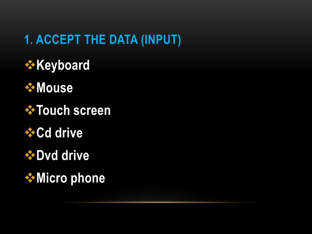 1. Accept the data (input) • Keyboard • Mouse • Touch screen • Cd drive • Dvd drive • Micro phone