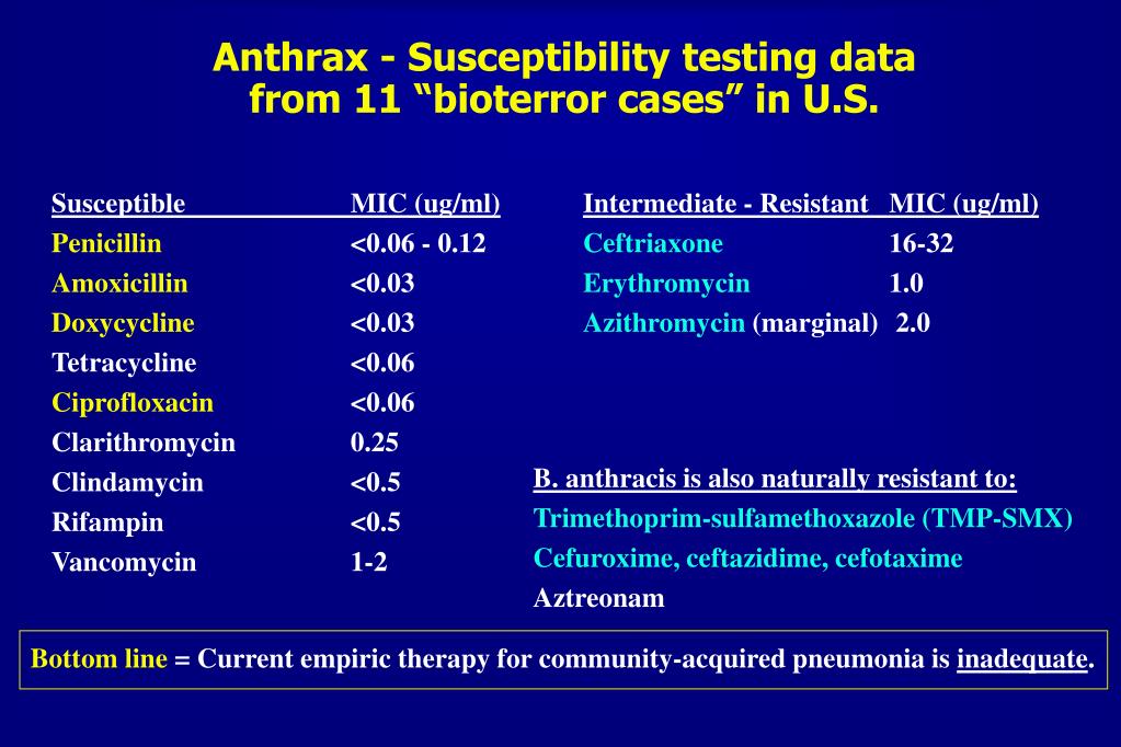 Bottom line = Current empiric therapy for community-acquired pneumonia is inadequate. Anthrax - Susceptibility testing data from 11 “bioterror cases” in U.S. Susceptible MIC (ug/ml) Penicillin <0.06 - 0.12 Amoxicillin <0.03 Doxycycline <0.03 Tetracycline <0.06 Ciprofloxacin <0.06 Clarithromycin 0.25 Clindamycin <0.5 Rifampin <0.5 Vancomycin 1-2 Intermediate - Resistant MIC (ug/ml) Ceftriaxone 16-32 Erythromycin 1.0 Azithromycin (marginal) 2.0 B. anthracis is also naturally resistant to: Trimethoprim-sulfamethoxazole (TMP-SMX) Cefuroxime, ceftazidime, cefotaxime Aztreonam