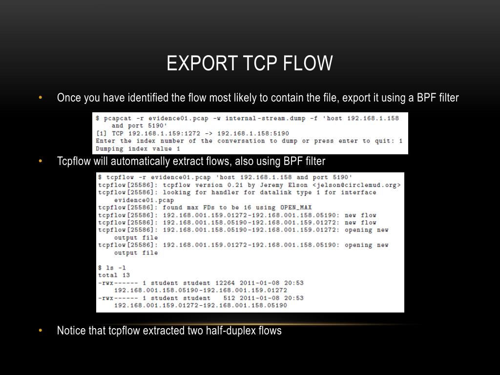 Export TCP flow • Once you have identified the flow most likely to contain the file, export it using a BPF filter • Tcpflow will automatically extract flows, also using BPF filter • Notice that tcpflow extracted two half-duplex flows