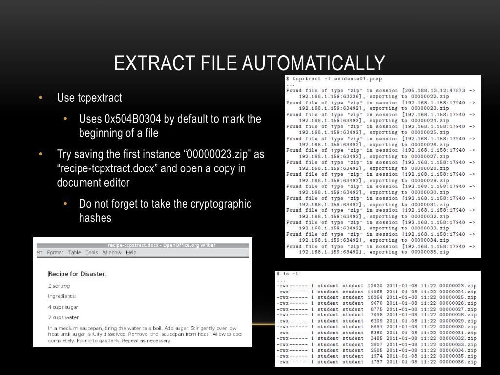 Extract file automatically • Use tcpextract • Uses 0x504B0304 by default to mark the beginning of a file • Try saving the first instance “00000023.zip” as “recipe-tcpxtract.docx” and open a copy in document editor • Do not forget to take the cryptographic hashes