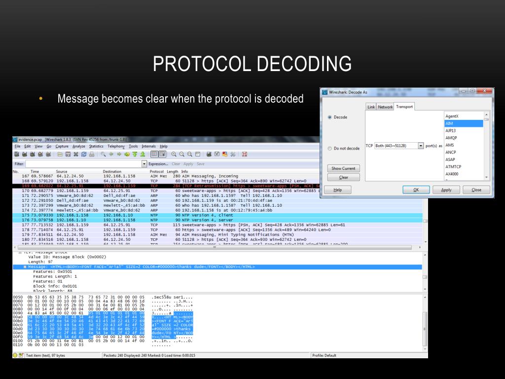 Scenario: Ann’s Bad AIM Anarchy-R-Us, Inc. suspects that one of their employees, Ann Dercover, is really a secret agent working for their competitor. Ann has access to the company’s prize asset, the secret recipe. Security staff are worried that Ann may try to leak the company’s secret recipe. Security staff have been monitoring Ann’s activity for some time, but haven’t found anything suspicious– until now. Today an unexpected laptop briefly appeared on the company wireless network. Staff hypothesize it may have been someone in the parking lot, because no strangers were seen in the building. Ann’s computer, (192.168.1.158) sent IMs over the wireless network to this computer. The rogue laptop disappeared shortly thereafter. “We have a packet capture of the activity,” said security staff, “but we can’t figure out what’s going on. Can you help?” http://forensicscontest.com/2009/09/25/puzzle-1-anns-bad-aim