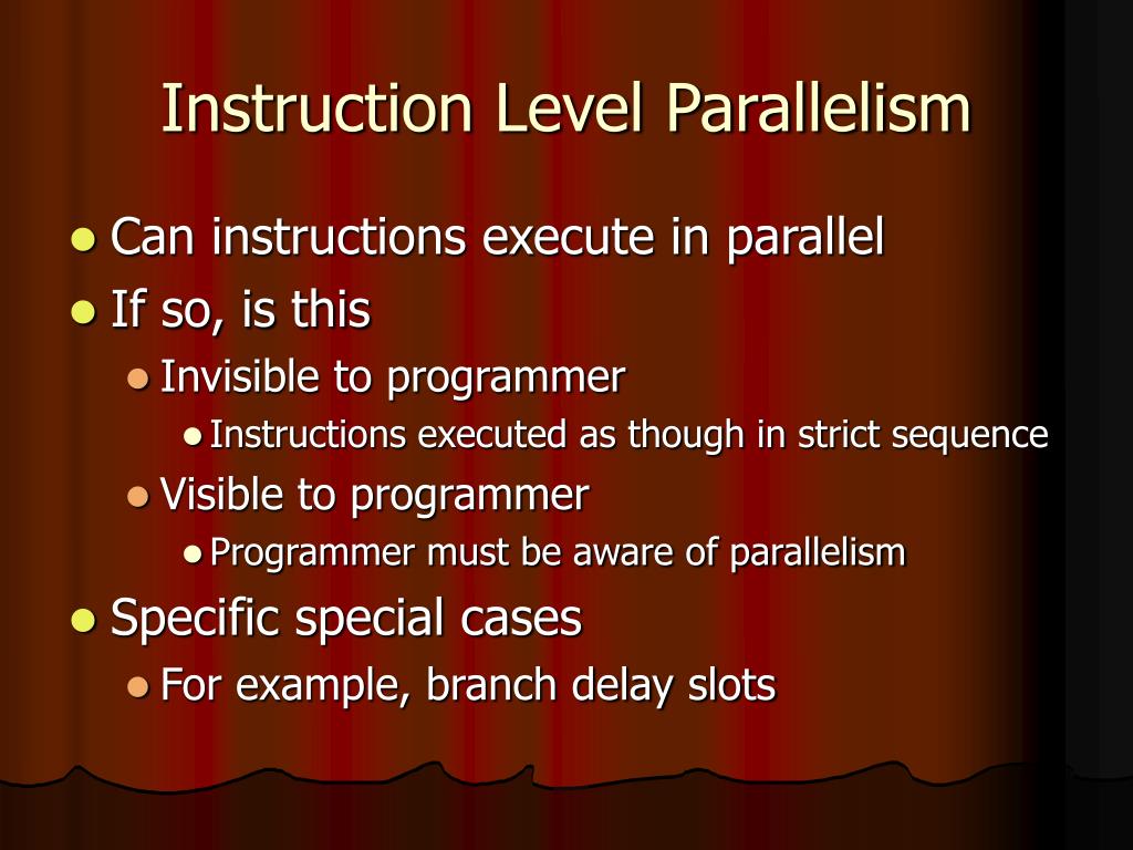 Instruction Level Parallelism • Can instructions execute in parallel • If so, is this • Invisible to programmer • Instructions executed as though in strict sequence • Visible to programmer • Programmer must be aware of parallelism • Specific special cases • For example, branch delay slots
