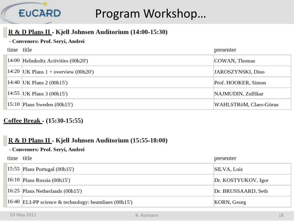 Program Workshop… 2 h free for discussions and additional short presentations (~5 min) R. Assmann