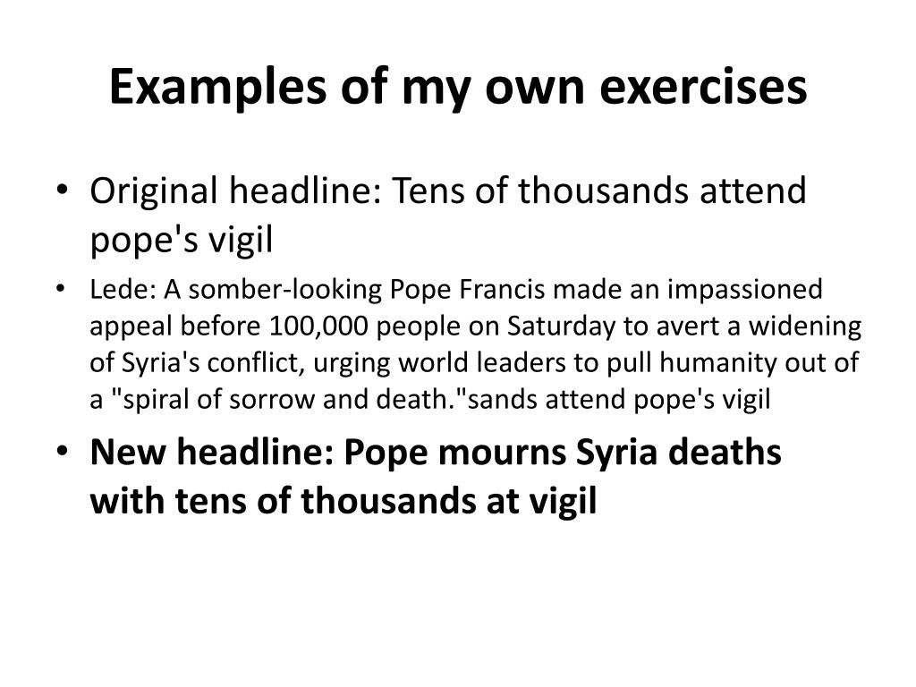 Examples of my own exercises • Original headline: Tens of thousands attend pope's vigil • Lede: A somber-looking Pope Francis made an impassioned appeal before 100,000 people on Saturday to avert a widening of Syria's conflict, urging world leaders to pull humanity out of a "spiral of sorrow and death."sandsattend pope's vigil • New headline: Pope mourns Syria deaths with tens of thousands at vigil