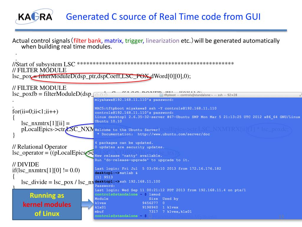 Generated C source of Real Time code from GUI Actual control signals(filter bank, matrix,trigger, linearization etc.)will be generated automatically when building real time modules. . . //Start of subsystem LSC ************************************************** // FILTER MODULE lsc_pox = filterModuleD(dsp_ptr,dspCoeff,LSC_POX,dWord[0][0],0); // FILTER MODULE lsc_poxfb = filterModuleD(dsp_ptr,dspCoeff,LSC_POXFB,dWord[0][1],0); . . for(ii=0;ii<1;ii++) { lsc_nxmtrx[1][ii] = pLocalEpics->ctr.LSC_NXMTRX[ii][0] * lsc_trx + pLocalEpics->ctr.LSC_NXMTRX[ii][1] * lsc_poxdc; } // Relational Operator lsc_operator = ((pLocalEpics->ctr.LSC_XTHRESH) <= (lsc_trx)); // DIVIDE if(lsc_nxmtrx[1][0] != 0.0) { lsc_divide = lsc_pox / lsc_nxmtrx[1][0]; } else{ lsc_divide = 0.0; } Running as kernel modules of Linux ICALEPCS 2013 at San Francisco, Osamu Miyakawa