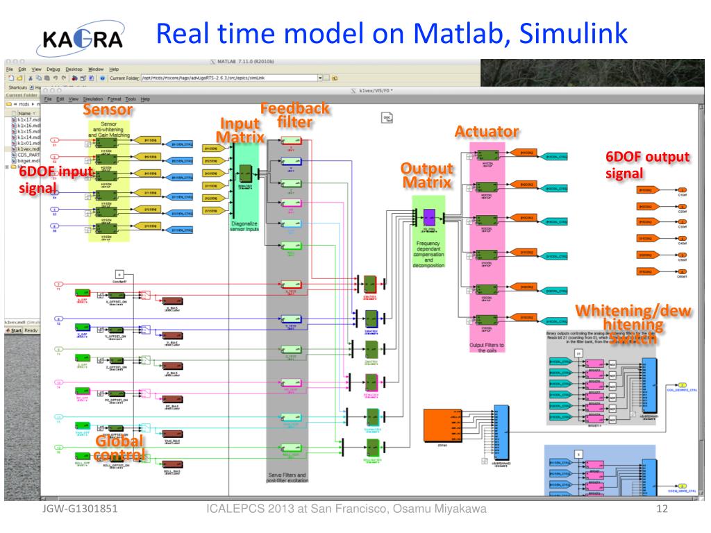 Real time model on Matlab, Simulink Feedback filter Sensor Input Matrix Actuator 6DOF output signal 6DOF input signal Output Matrix Whitening/dewhitening Switch Global control ICALEPCS 2013 at San Francisco, Osamu Miyakawa