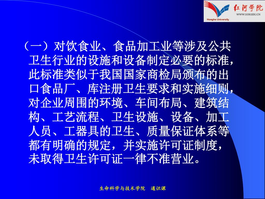(一)对饮食业、食品加工业等涉及公共卫生行业的设施和设备制定必要的标准,此标准类似于我国国家商检局颁布的出口食品厂、库注册卫生要求和实施细则,对企业周围的环境、车间布局、建筑结构、工艺流程、卫生设施、设备、加工人员、工器具的卫生、质量保证体系等都有明确的规定,并实施许可证制度,未取得卫生许可证一律不准营业。(一)对饮食业、食品加工业等涉及公共卫生行业的设施和设备制定必要的标准,此标准类似于我国国家商检局颁布的出口食品厂、库注册卫生要求和实施细则,对企业周围的环境、车间布局、建筑结构、工艺流程、卫生设施、设备、加工人员、工器具的卫生、质量保证体系等都有明确的规定,并实施许可证制度,未取得卫生许可证一律不准营业。 生命科学与技术学院 通识课