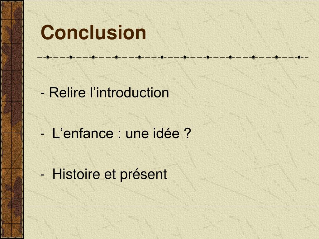Conclusion - Relire l’introduction • L’enfance : une idée ? • Histoire et présent
