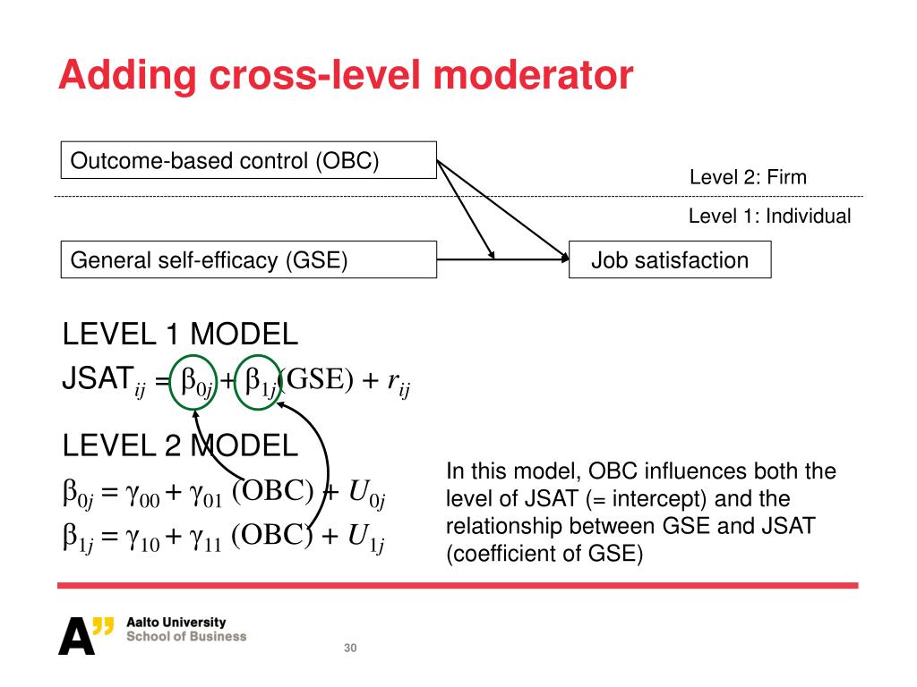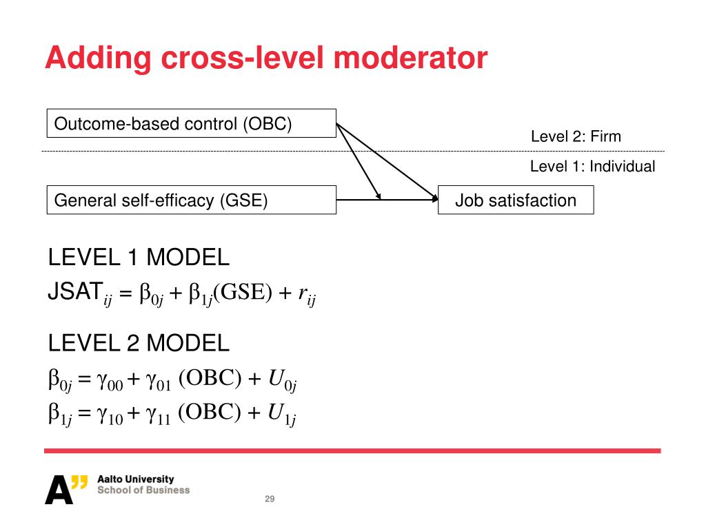 Adding cross-level moderator Outcome-based control (OBC) Level 2: Firm Level 1: Individual General self-efficacy (GSE) Job satisfaction LEVEL 1 MODEL JSATij = β0j + β1j(GSE) + rij LEVEL 2 MODEL β0j = γ00 +γ01 (OBC) + U0j β1j= γ10 + γ11 (OBC) + U1j