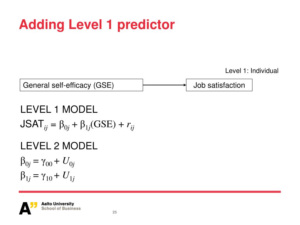 Adding Level 1 predictor Level 1: Individual General self-efficacy (GSE) Job satisfaction LEVEL 1 MODEL JSATij = β0j + β1j(GSE) + rij LEVEL 2 MODEL β0j = γ00 + U0j β1j= γ10 + U1j