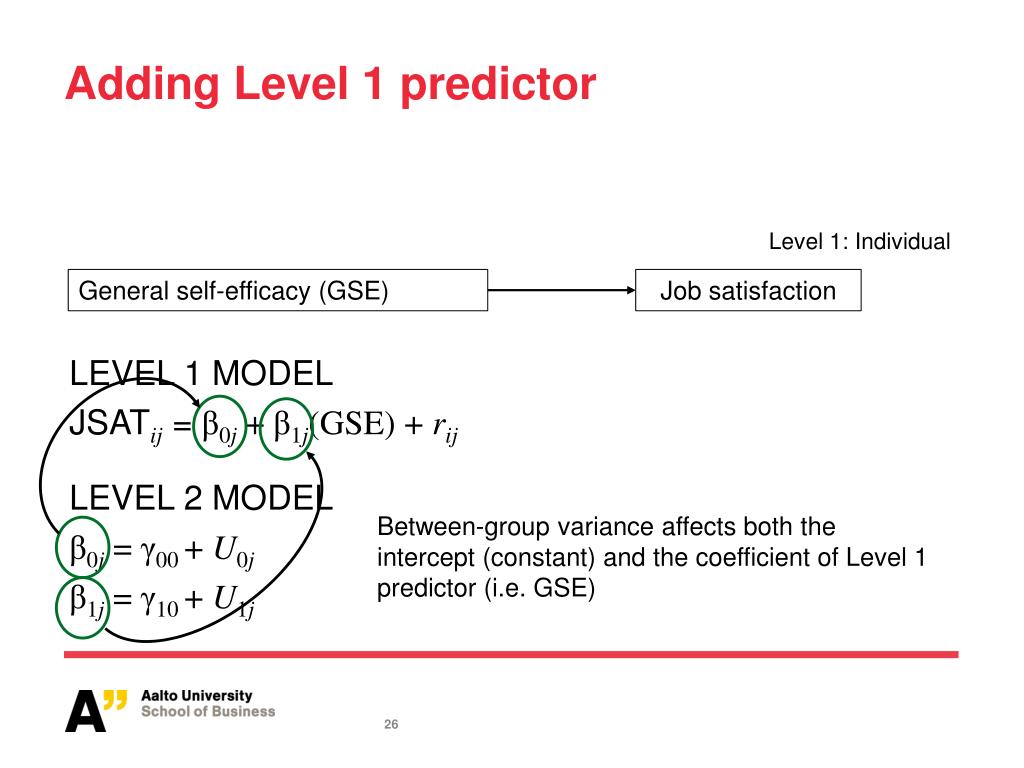 Adding Level 1 predictor Level 1: Individual General self-efficacy (GSE) Job satisfaction Between-group variance affects both the intercept (constant) and the coefficient of Level 1 predictor (i.e. GSE) LEVEL 1 MODEL JSATij = β0j + β1j(GSE) + rij LEVEL 2 MODEL β0j = γ00 + U0j β1j= γ10 + U1j