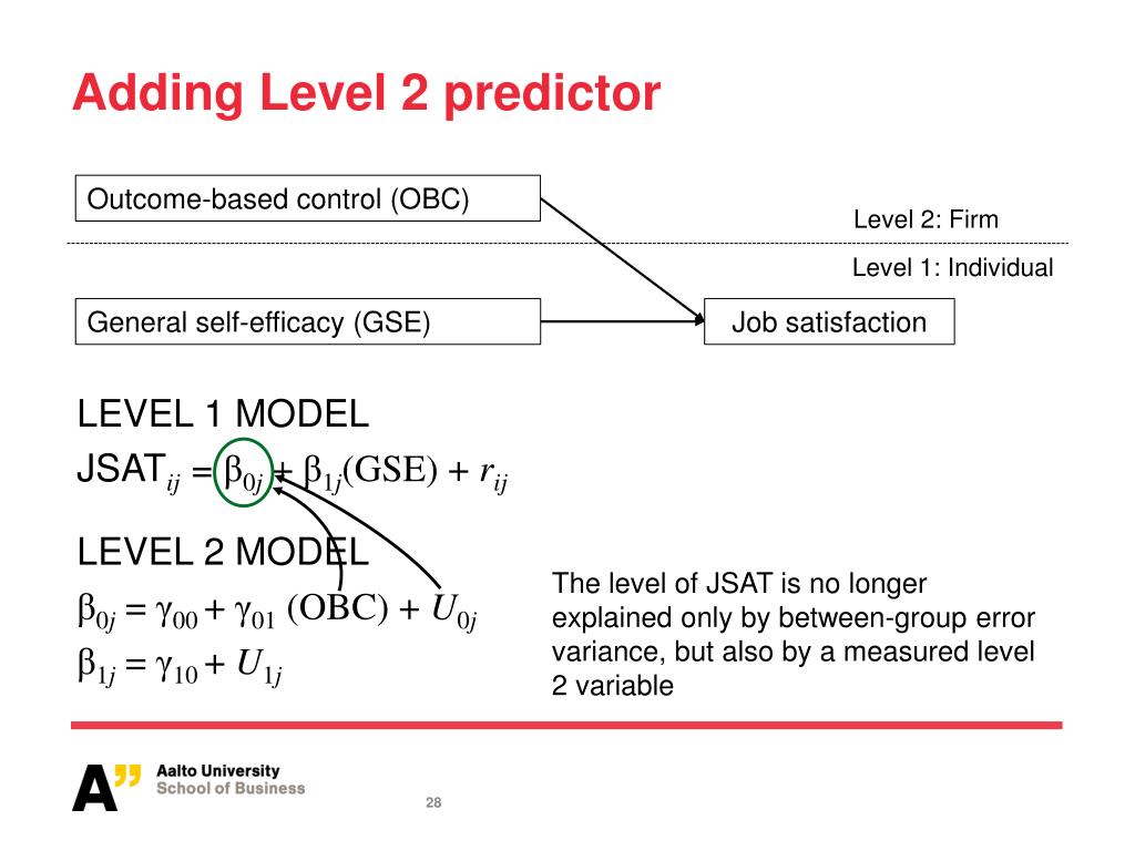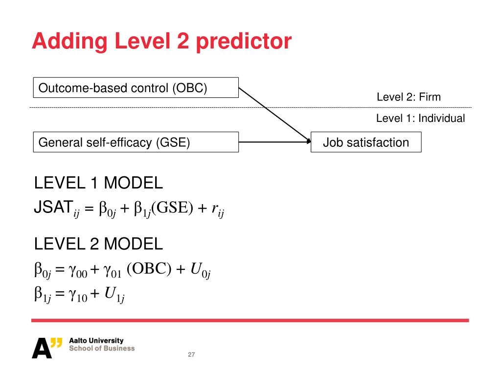 Adding Level 2 predictor Outcome-based control (OBC) Level 2: Firm Level 1: Individual General self-efficacy (GSE) Job satisfaction The level of JSAT is no longer explained only by between-group error variance, but also by a measured level 2 variable LEVEL 1 MODEL JSATij = β0j + β1j(GSE) + rij LEVEL 2 MODEL β0j = γ00 +γ01 (OBC) + U0j β1j= γ10 + U1j
