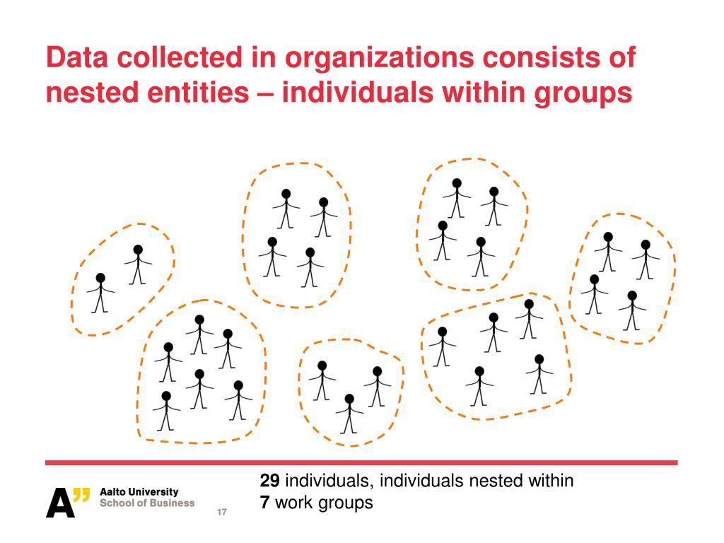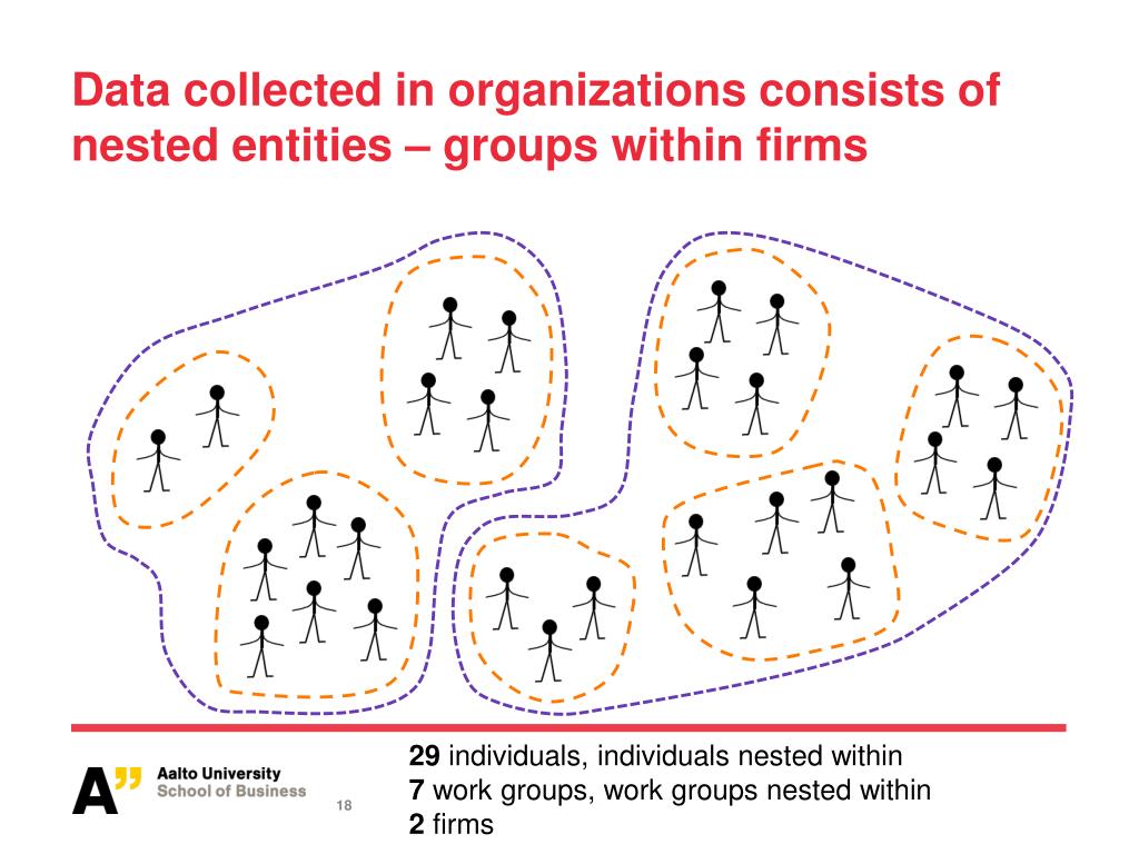 Data collected in organizations consists of nested entities – groups within firms 29 individuals, individuals nested within 7 work groups, work groups nested within 2 firms