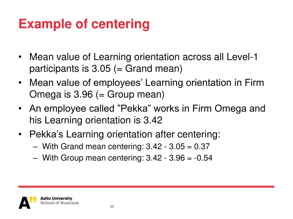 Example of centering Mean value of Learning orientation across all Level-1 participants is 3.05 (= Grand mean) Mean value of employees’ Learning orientation in Firm Omega is 3.96 (= Group mean) An employee called ”Pekka” works in Firm Omega and his Learning orientation is 3.42 Pekka’s Learning orientation after centering: • With Grand mean centering: 3.42 - 3.05 = 0.37 • With Group mean centering: 3.42 - 3.96 = -0.54