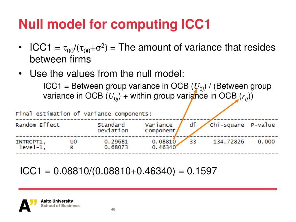 Nullmodel for computing ICC1 ICC1 = 0.08810/(0.08810+0.46340) = 0.1597 ICC1 =τ00/(τ00+σ2) = The amount of variance that resides between firms Use the values from the null model: ICC1 = Between group variance in OCB (U0j) / (Between group variance in OCB(U0j) + within group variance in OCB(rij))